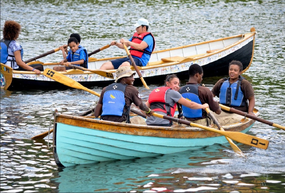 Every weekend, Rocking the Boat brings its boats down to the Bronx River waterfront at Hunts Point Riverside Park to offer free rowing to the public.