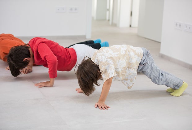 This one is a lot of fun for parents (and the kids). You get to be Simon and tell the kids what to do between or during each push-up set. Examples include doing three push-ups and then running around in a circle, or do a push-up with your hand behind your back. Get creative! Let the kids take a turn as Simon, too, or you may face a revolt. Remember, if you don’t say, "Simon says," whoever moves to follow the command is out.