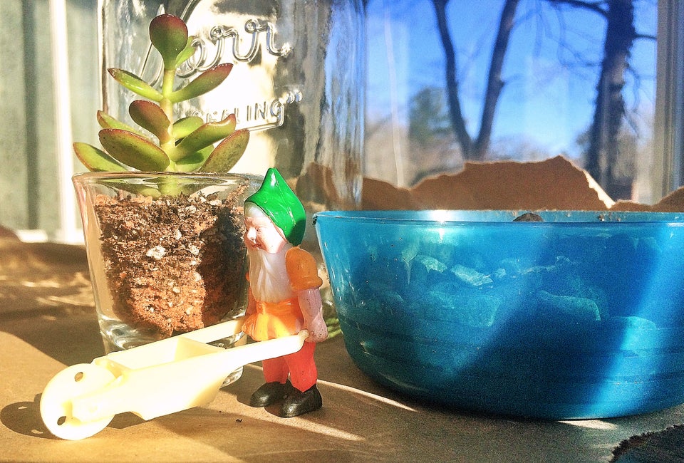 You can make your own terrarium with things you probably have around the house: an old jar or glass, and a spare toy figurine. Add natural elements like pebbles, seashells, pinecones, twigs and moss. Pick up a small succulent at the green market or florist (or take a clipping from one you already have), and you'll be all set to make your own little world.