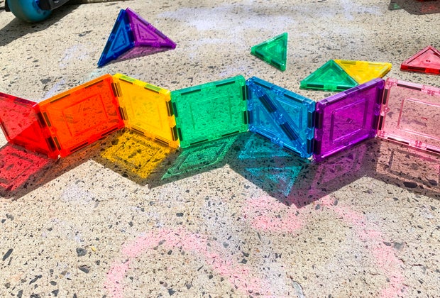 Shine a flashlight through anything colorful and transparent, like magnetic tiles, to project a rainbow of colors. Overlap different colors to explore color mixing.