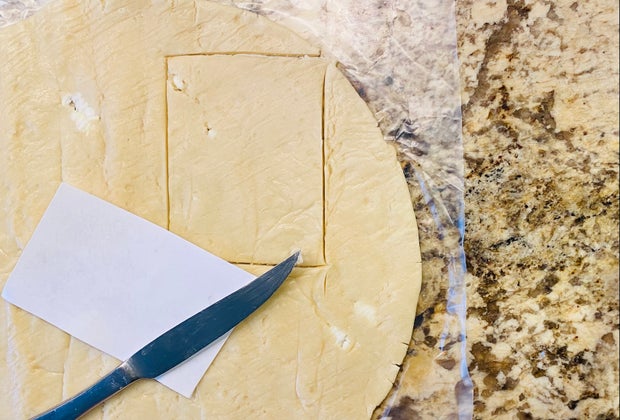 Using a paper cutout rectangle, cut the pie dough into rectangles. You can pull all the dough scraps together and roll the dough out to a ¼ layer and cut out the remaining rectangles. Make sure you have an even amount of rectangles.