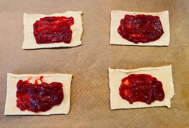 Scoop about a tablespoon-sized dollop of filling into the center of the rectangles. You can use jam or preserves, or get more creative with chocolate, chia jam, or Nutella!