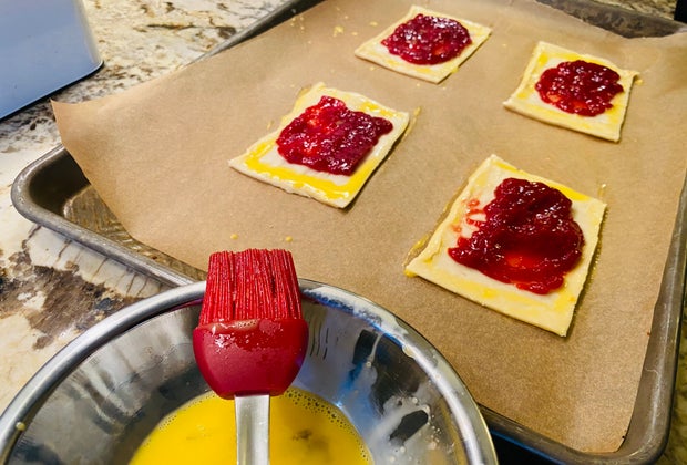Place the top rectangle onto each jelly-filled rectangle. Using a fork, gently seal the two rectangles together. Brush the remaining egg wash over the tops of the pop tarts.