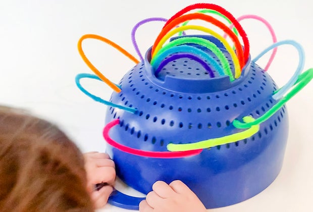 Boost fine motor skills with a colander and some colorful pipe cleaners. Photo courtesy of Liz Baill, @creativishmom