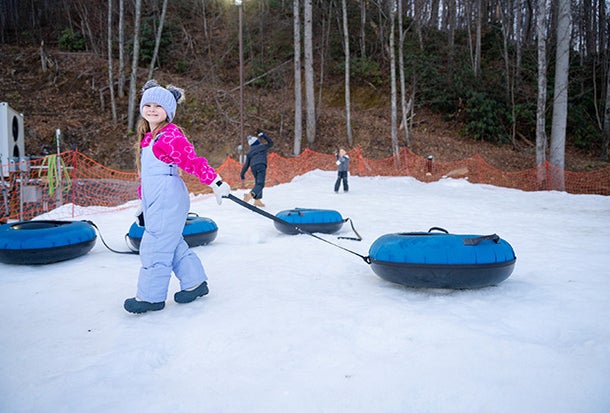 Rowdy Bear's features the longest and fastest snow tubing in Tennessee. Take in the views of the Smoky Mountains as you slide and twist down the 500-foot run with a 70-foot drop. The massive snow pile for playing and a large playground delight younger kids.