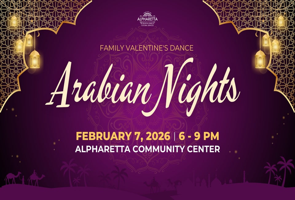 The City of Alpharetta hosts a Valentine's Dance for the whole family. This year the theme is Arabian Nights and the Alpharetta Community Center will be transformed a land of shimmering lanterns, hidden treasures, and golden sands.