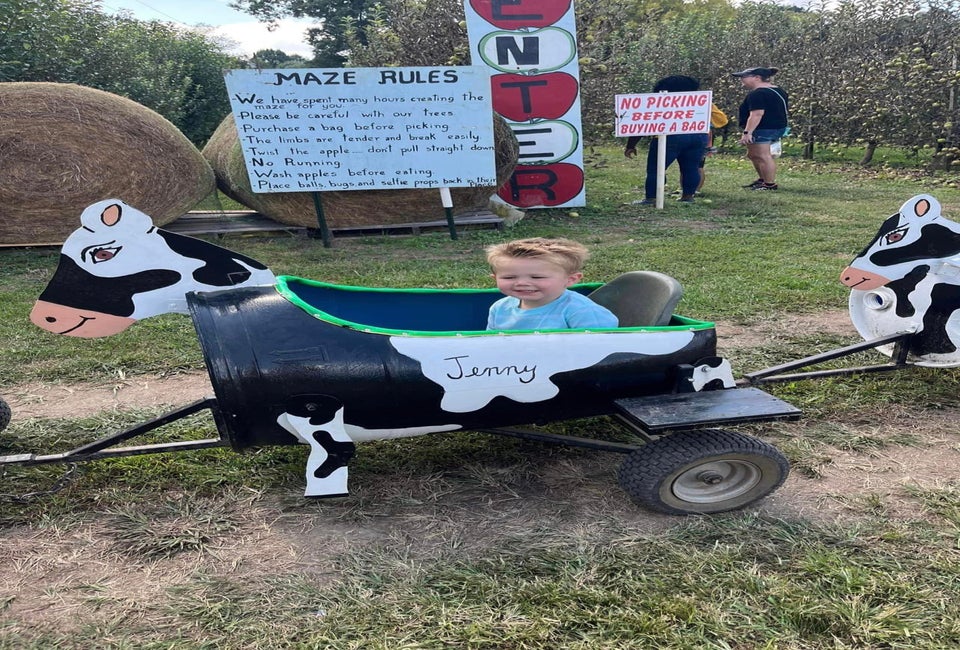 On weekends in September and October, visitors to Hillcrest Orchards get to pick apples and experience all kinds of attractions like the apple tree maze, cow train rides, cow milking, mini golf, wagon rides, as well as live shows, like pig racing.