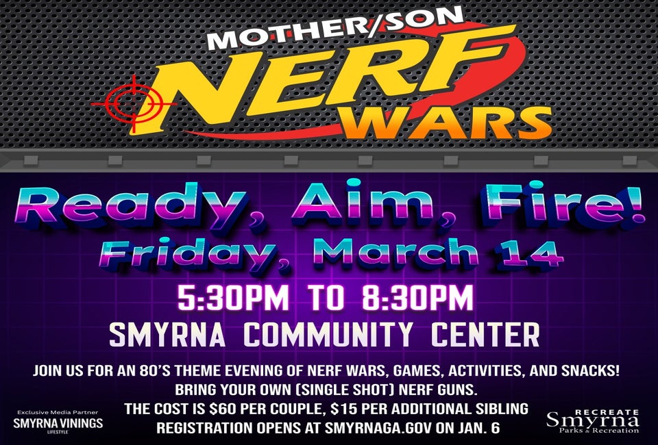 At this fun and crazy event, mothers and sons engage in Nerf wars, activities, games, and snacks. Moms and sons bring their own single-shot Nerf gun and the facility provides darts and goggles.