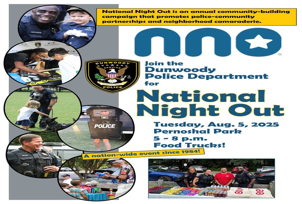 Join members of the Dunwoody Police Department for National Night Out. Bring the whole family for an evening of fun, food, community, and public safety! Meet your local officers, check out emergency vehicles, and face painters, giveaways, and more.