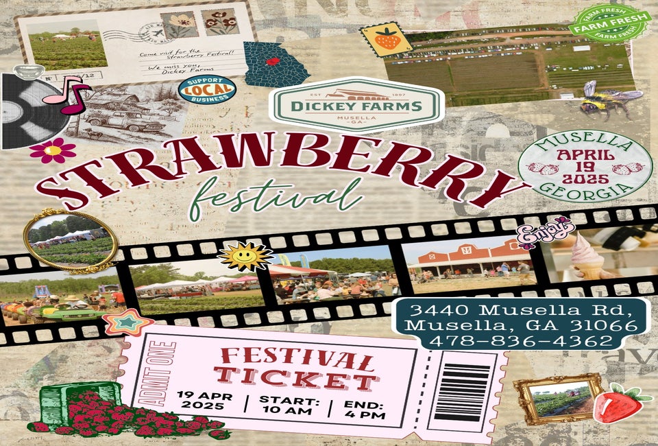 Dickey Farms in Musella hosts a strawberry festival to celebrate another amazing strawberry season. They will have delicious Dickey Farms strawberries and fresh produce, local vendors, yummy food trucks, live music, kids zone with inflatables, and much more for all your family fun.