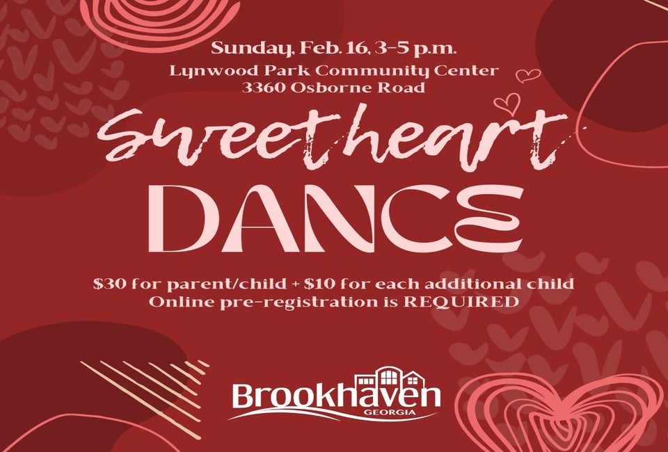 All parent/child pairs, including grandparents, aunts, uncles, older siblings, are welcome to attend the popular Sweetheart Dance in Brookhaven. The event includes music, dancing, a photo booth and snacks.