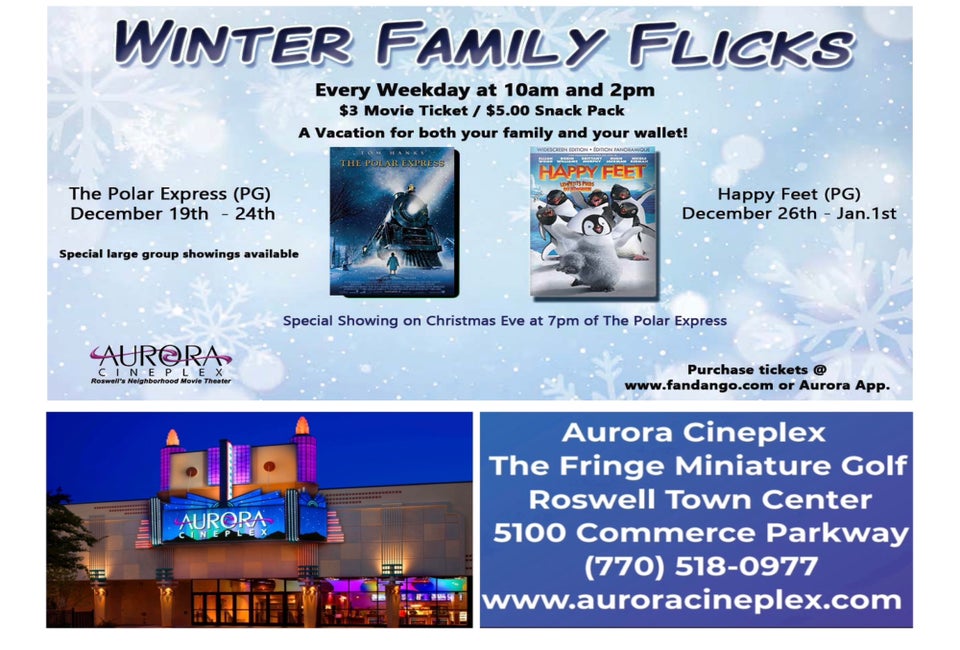 Aurora Cineplex in Roswell has $ 3.00 winter family flicks weekdays at 10am & 2pm during the December Holidays.