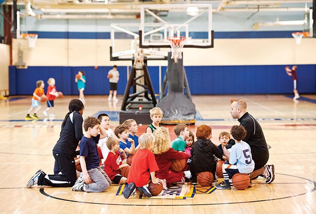 Kids huddle for instruction at a Chelsea Piers basketball clinic. Photos courtesy of the venue/organizations.