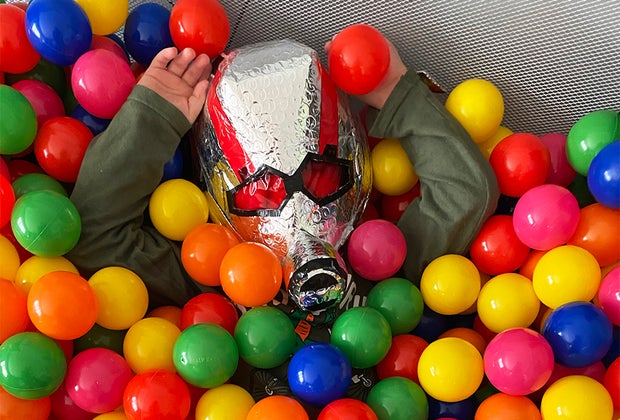 Combine two top toys: Dress-up in favorite costume, then jump into a homemade ball pit! Photo by the author