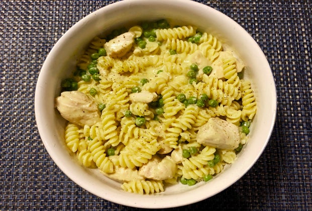 - Return chicken to pan and add frozen peas. Cook until pasta is tender and all the broth is absorbed, about 3-5 more minutes.