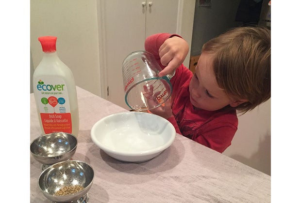 Now dip the tip of your finger into the liquid dish soap—you don’t need much.