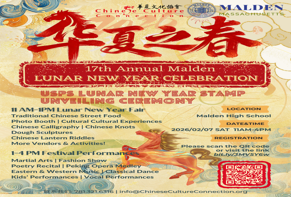 The 17th Annual Malden Lunar New Year Celebration is a free, family-friendly event filled with delicious street food, traditional crafts, lion dances, cultural performances, and the USPS Year of the Horse stamp unveiling.