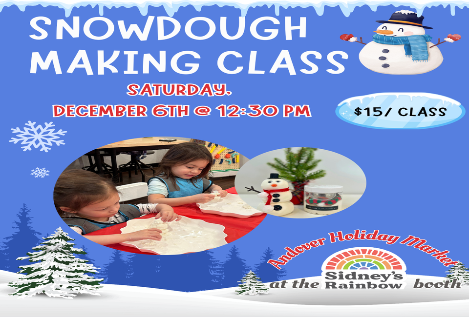 Join The Village Playspace at Sidney's Rainbow's booth during the Andover Holiday Market for a hands-on Snowdough Making Class. In this fun and creative workshop, little hands will bring imagination to life as they shape, mold, and explore colorful dough.