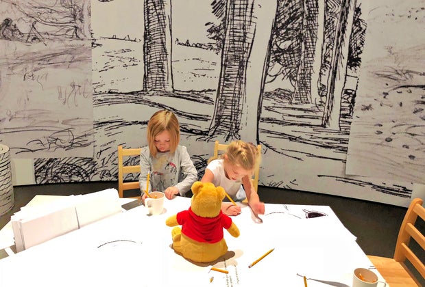 From here, it’s like you’ve stepped into a Pooh adventure of your own, with walls covered in whimsical illustrations from stories. Walk, or even run, over a foot bridge in the Hundred Acre Woods that crosses over a screen projecting a river filled with Pooh-esque words like "careless" and "sunny" floating by. For aspiring artists, there’s a kid-sized table and chairs with paper and pencils set up among walls covered in sketches. Use your surroundings for inspiration and create your own Pooh story and sketch.