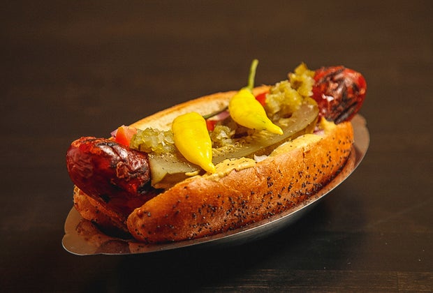 The Duck Inn in Bridgeport is known for the rotisserie duck and their Duck Inn Dog. The Duck Inn Dog is made with all-natural beef and duck fat. This elevated hotdog features all the classic Chicago-style toppings on a brioche poppy seed bun. Food and Wine Magazine as well the Food Network have recently given the Duck Inn Dog national praise.
