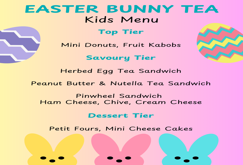 Easter Bunny Tea is a whimsical event that brings the spirit of Easter to life with a variety of teas, bites, and festive activities, including Easter-themed crafts and entertainment. With a special appearance by the Easter Bunny, guests of all ages can enjoy a magical experience filled with joy, laughter, and plenty of Easter cheer. Whether you're relaxing with a cup of tea or sipping a glass of bubbly, this delightful gathering promises a memorable celebration.