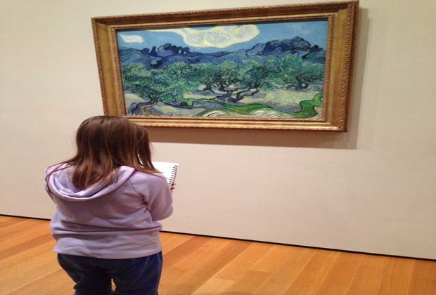 Pack a bag of colored pencils and paper and do like the art students do: plop down on the floor and draw. Ask the kids to choose their favorite work or two and try to draw it in their own sketchbook.