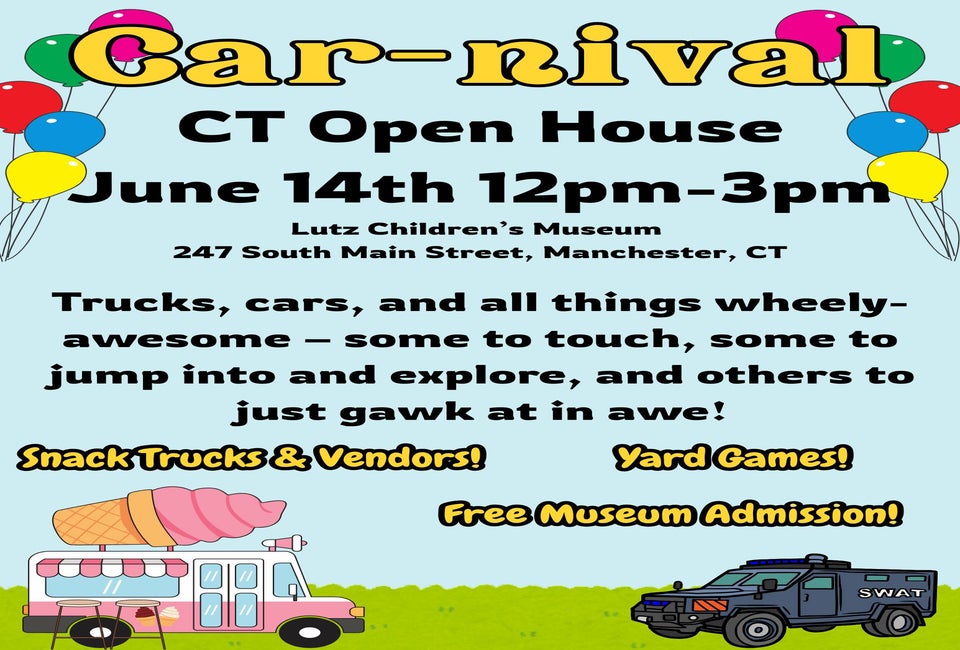 Trucks, cars, and all things wheely-awesome! There will be some vehicles that you can touch, some to jump into and explore, and others to just gawk at in awe. Come join us at the Lutz Children's Museum as we celebrate CT Open House Day with a fun event, snack truck, vendors, yard games, and FREE ADMISSION.