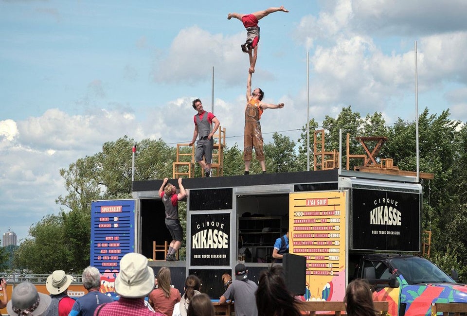 Cirque Kikasse presents SANTÉ! a dynamic circus show with high-level acrobatics, contagious energy and breathtaking balances...All on our extraordinary food truck! The troupe's mission is to prepare the Terrace for the service by unveiling their unique installation. Ranging from arranging furniture that turns into a balancing tower 30 feet off the ground, to playfully inefficient cleaning of the truck and trampoline, to overflowing the popcorn machine.