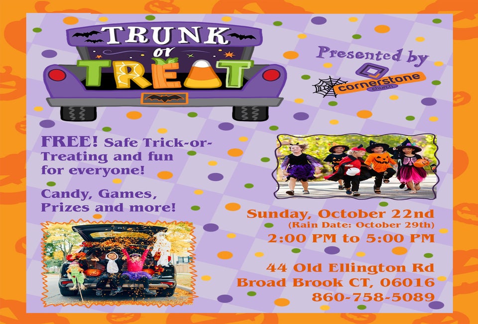 Join Cornerstone for Trunk or Treat 2023. This is a free community event for the whole family, so dress up in your favorite Halloween costumes and bring the whole family to Cornerstone Church for safe trick or treating for the kids, games, prizes and more.