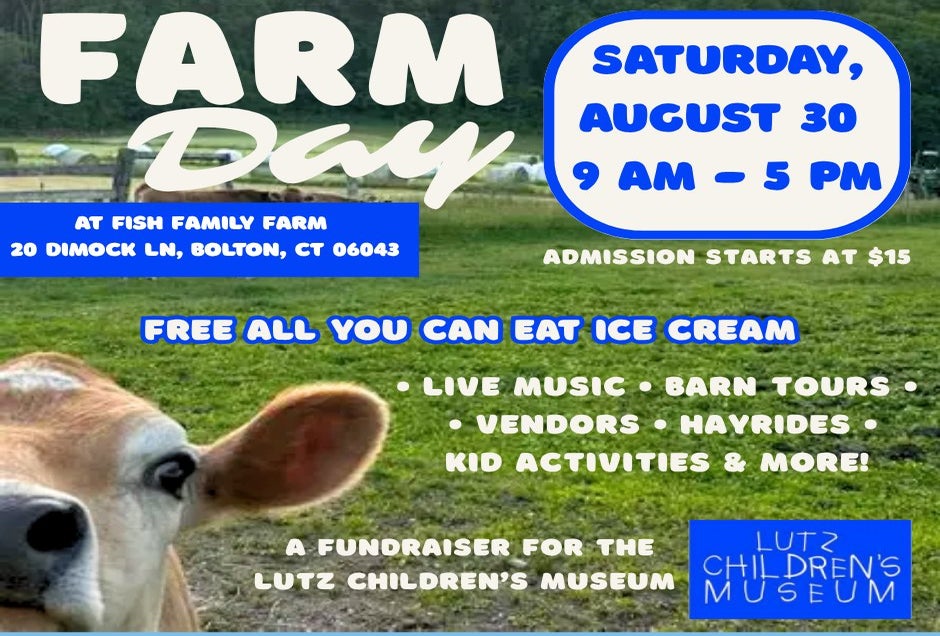 Join the Lutz for our biggest annual fundraiser: Farm Day 2025! Admission includes unlimited farm fresh ice cream, barn tours, hayrides, live music and more! The beautiful Fish Family Farm in Bolton, CT will be full of things to do all day.