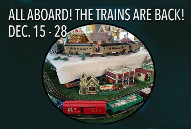 All aboard! The trains are back! Gallery 25 is celebrating the season with its special miniature railroad set up on tracks running through the gallery. This miniature railway is particularly appropriate since G25 is housed in a charming historic railroad building.