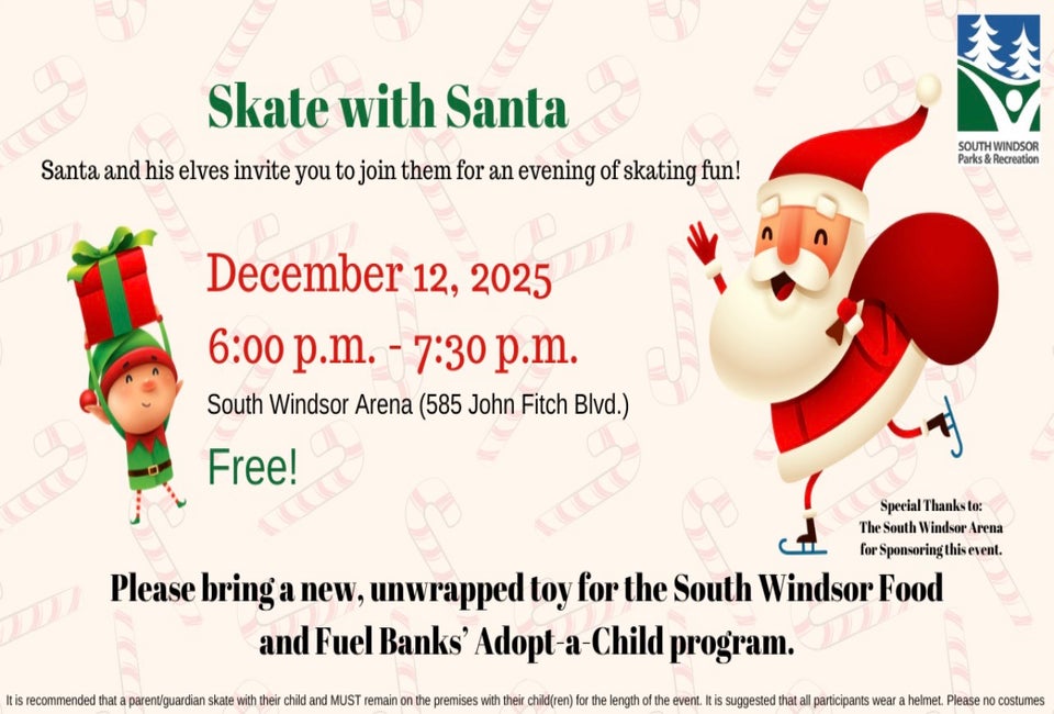 Join Santa and his elves for an evening of holiday skating fun! Please bring a new, unwrapped toy for the South Windsor Food and Fuel Bank’s Adopt-a-Child program!