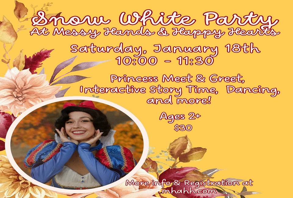 Join us at the studio for a special morning with Snow White. Your little one will enjoy a meet and greet, interactive story time, sing alongs, crafts, and more.