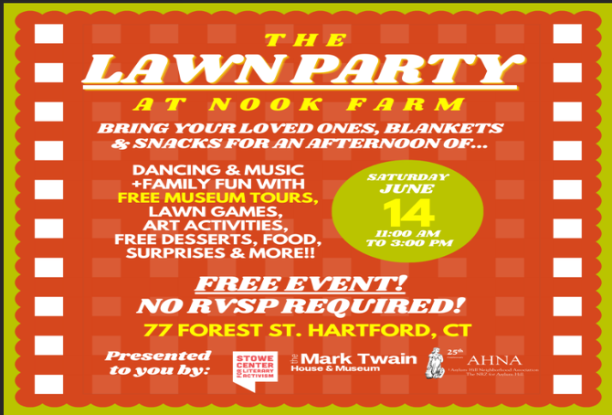 Join us in celebration for the Lawn Party at Nook Farm, presented by The Harriet Beecher Stowe Center, The Mark Twain House & Museum, and the Asylum Hill Neighborhood Association.