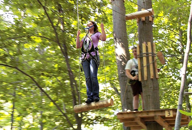 Older kids and grown ups can work up to higher and longer ropes and zip lines. Photo courtesy of Nomads Outdoor Ropes Course