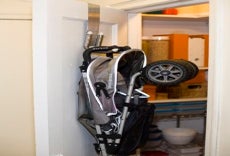 Mary Ann Malone, a NYC mom of three who lives in a one-bedroom apartment, thought of the StrollAway after her building received a fire code violation because her stroller was parked in the hallway! (Clearly it got her creative fires burning.) An over-the-door hook, it's perfect for folding or umbrella models, and can hold up to 35 pounds. The StrollAway is made of sturdy steel and adjusts to a variety of door widths, no drilling or screws required. $39.99 at metrotots.com