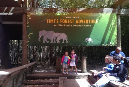 On our most recent visit, my daughters and I made sure to check out the new live show, Fimi's Forest Adventure: An Elephant's Journey Home. The show is part of the Zoo's new 96 Elephants campaign to promote awareness of African forest elephants that are being hunted by poachers for their ivory tusks. This is an important animal rights issue and, like many serious issues, it can be tricky finding a way to give kids informative and educational experiences in a gentle way that inspires compassion. My youngest daughter has wanted to be a veterinarian all five years of her life. She adores animals and is a natural caretaker. Elephants happen to be her favorite animal, so when I first heard about the campaign I was curious, but also wondered if it would be too much for her and my other young daughter. I want them to be sensitive and mindful of all living creatures but don't want to scare them with images of animals being mistreated or worse. I wanted to learn more about the campaign and what we could do to help, yet worried about harsh images or shows surrounding the initiative.