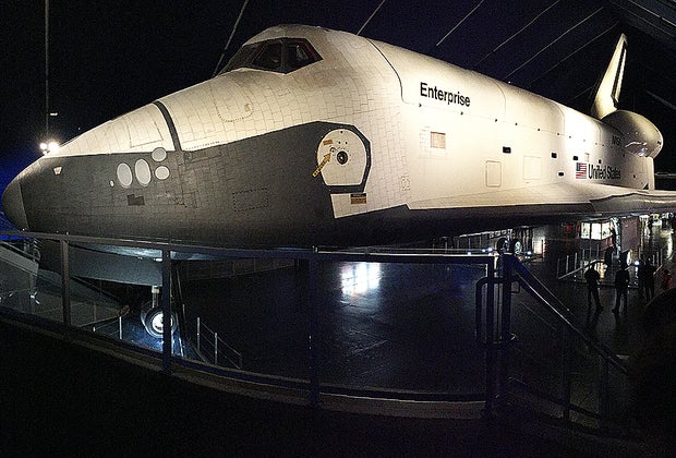 The Enterprise is housed in the Space Shuttle Pavilion on the ship's flight deck.
