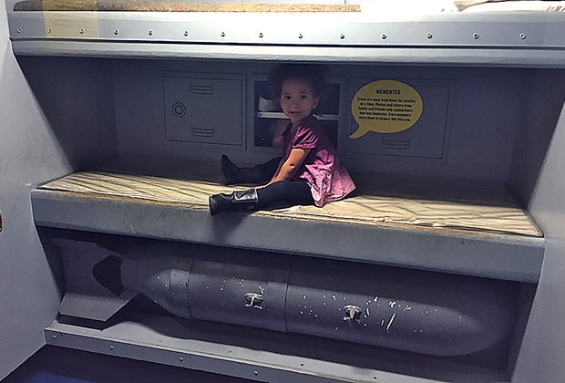 1. The Exploreum: If your kid isn't a full-on history nerd, this section of the Hangar Deck (the main exhibition space) is the most kid-friendly spot on board. This interactive space lets kids climb into a cockpit, pose as the pilot of a small helicopter, explore a submarine's tiny quarters, or fold up like a pretzel to squeeze into a space capsule. There are plenty of kid-friendly buttons to push, steering wheels to twirl, and more.