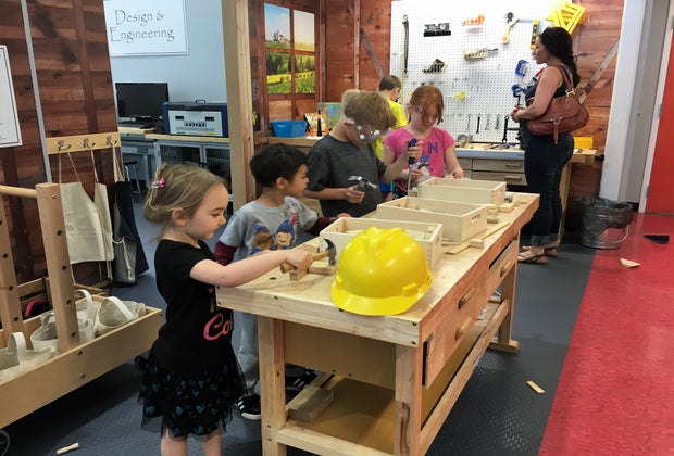 Children tinkering with tools in the Design & Engineering section. Hard hats optional.