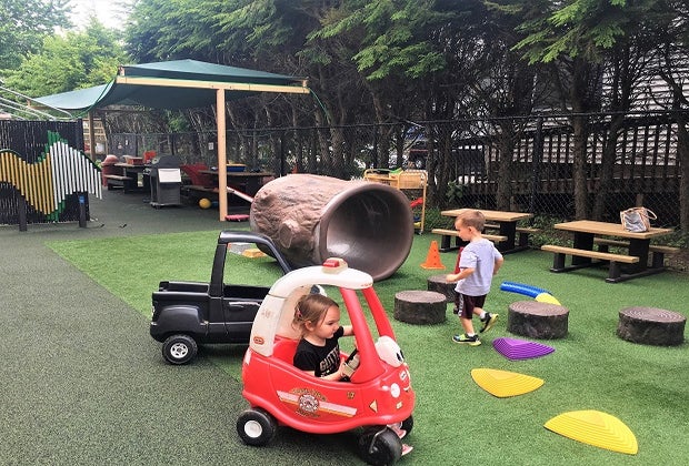 - An outside play area is equipped with sand, water, a playscape, and other fun toys.