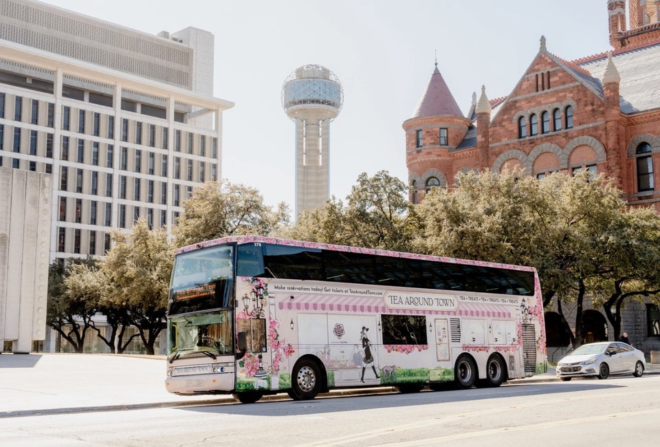Experience the vibrant energy of Tea Around Town in Dallas. Our iconic pink bus is adorned with beautiful blooms, creating a joyful backdrop as you discover the heart of Texas. Sip on fine tea, indulge in delectable treats, and sing along with our entertainers as you pass by landmarks like Reunion Tower, Dealey Plaza, and the Dallas Arts District!