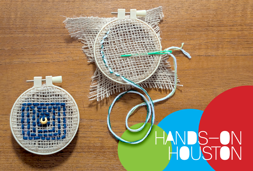 Explore the art of embroidery at this month’s Hands-on Houston! Learn how to thread a kid-friendly needle and design your own composition using a hoop and burlap (a beginner-friendly loose weave cloth). Add interesting shapes and textures to your artwork using yarn and beads, and leave with a finished hoop ready to hang in your home!