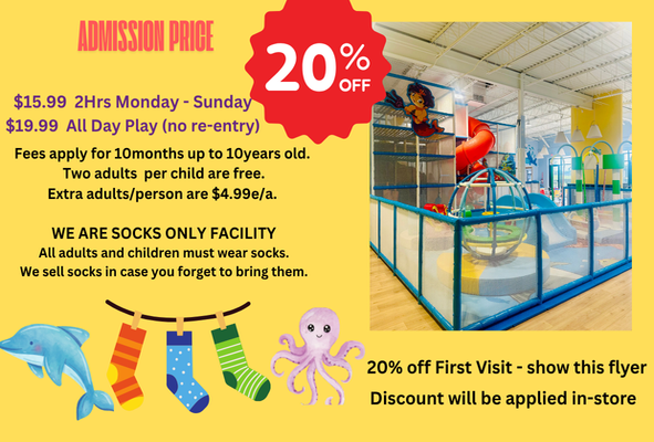 Enjoy 20% off your first visit to Play Bliss—valid for 2-hour or all-day play passes, any day, no expiration. Just show this flyer at the front desk to redeem in-store!