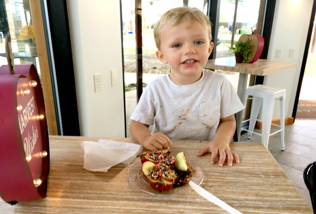 Tearing my son away from the different moon walks to check out the other activities proved to be no small feat; every time I got him to leave one, he immediately darted over to jump into another one, and it was only after I explained that we were going to turn an apple into candy that I was able to lure him away. We headed inside to try our hand at the self-serve candy apple bar, which featured candy apple coatings like chocolate syrup, caramel sauce, sprinkles, and nuts we used to coat our ripe, red apples.