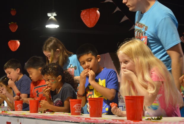 Kids participating in a strawberry eating contest inside the Kids Zone.