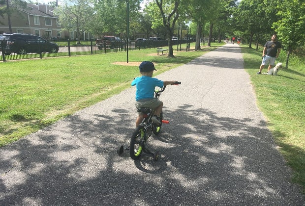 The trails at Meyer Park loop through the park past multiple playing fields, two different playgrounds, a fishing lake and duck pond and picnic areas, and are perfect for little ones learning to ride their bikes. There are also plenty of benches to stop at along the trails, and the squirrels are so accustomed to friendly faces that they have no problem coming up close to say hi.