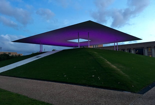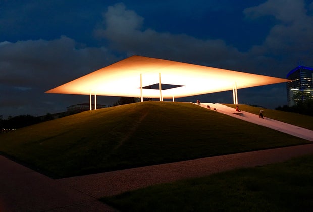 Located at the Suzanne Deal Booth Centennial Pavilion at Rice University, Turrell's "Twilight Epiphany" Skyspace looks, at first glance, like something from outer space. The two-level pyramidal structure with an opening in its roof sits on an immaculately manicured hill near the Shepherd School of Music. It's an architectural sight to behold on its own, but the real magic happens at sunrise and sunset. Well, about 40 minutes before sunrise, and about 8-10 minutes before sunset, to be precise. During these times, a mesmerizing light show takes place as LED light is projected onto the roof of the Skyspace.