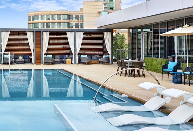 Just on the outskirts of Houston overlooking The Woodlands Waterway, this rooftop pool boasts lounge chairs with stunning views. Day passes are available for guests 21+, but to make it a family-friendly affair, a stay is required. Private shaded cabanas, towel service, access to food and beverage services, and more make this a favorite.