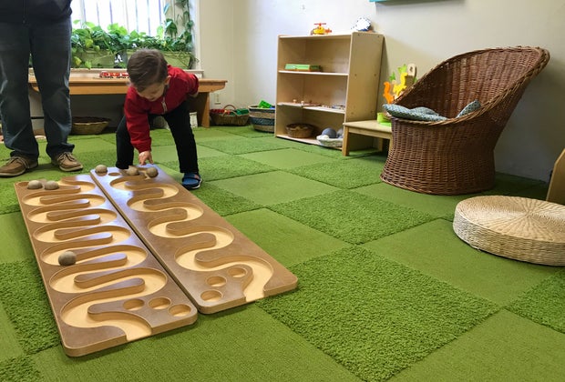 Enjoying the wooden toys in the toddler room.